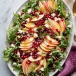 The dish is a colorful salad served on a large white plate placed on a white marbled surface. The salad has several layers starting with a base of bright green arugula leaves spread evenly across the plate. On top, there are thin slices of red apple fanned out in small groups, adding a fresh red and yellow touch. Scattered over the salad are shiny, dark red pomegranate seeds that give a pop of deep color. Small bits of white cheese are sprinkled all over, adding a creamy texture. The whole dish looks vibrant and fresh, with a slight shine from a light dressing. Photo taken with an iphone --ar 4:5 --v 7