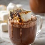 A clear glass mug filled almost to the top with rich, dark brown hot chocolate shows some thick texture around the edges where the drink meets the glass. Floating on top is a large, toasted marshmallow with a golden brown and slightly charred surface, sitting near the rim of the mug. The background is a soft blur of neutral tones with white marbled texture below the mug, emphasizing the warm drink. photo taken with an iphone --ar 4:5 --v 7