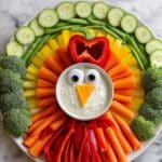 This fun and festive Turkey Veggie Tray is a perfect healthy appetizer for Thanksgiving or any fall gathering. It features a colorful assortment of fresh vegetables arranged in the shape of a turkey, complete with a red bell pepper face accented by candy eyeballs and carrot beak. A bowl of your favorite dip in the center completes this beautiful and nutritious party platter.