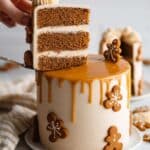 - Final Frosting and Garnish: Use remaining frosting to evenly coat the top and sides of the cake, smoothing carefully with a cake scraper. Garnish with vegan gingerbread cookies if desired, and drizzle the remaining caramel sauce over the top of the cake just before serving.