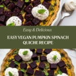This vegan pumpkin and spinach quiche offers a creamy, savory filling nestled in a gluten-free chickpea and pumpkin crust. Packed with nutrient-rich ingredients like tofu, spinach, and beetroot, it’s a wholesome and flavorful dish perfect for any occasion, served warm or cold.