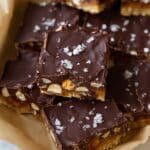 Several chocolate-topped dessert squares are stacked closely together on light brown parchment paper, showing three main layers. The bottom layer is a light tan cookie or biscuit base with a crunchy texture, the middle layer contains chunks of nuts and is golden brown with a rough texture, and the top layer is a thick, glossy dark chocolate coating sprinkled with flaky sea salt crystals, giving a shiny, slightly wavy surface. The edges of the squares are clean but irregular, showing some of the nut pieces peeking through the chocolate. The whole scene is set against a white marbled texture but only the squares and parchment paper are in focus. photo taken with an iphone --ar 4:5 --v 7