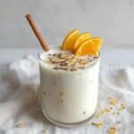 A clear glass filled with a creamy white frothy drink topped with thinly sliced almonds, small dark seeds, and light yellow zest scattered across the surface; two small orange slices are placed on the edge of the glass, adding a bright, fresh color contrast; a light brown wooden stick rests inside the glass on the left side; the glass sits on a soft white cloth against a white marbled background. photo taken with an iphone --ar 4:5 --v 7