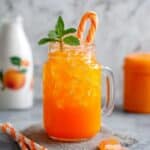 A clear glass mug filled with three visible layers of bright orange liquid with ice cubes inside, giving a cool and refreshing look; the top is decorated with two fresh green mint leaves and a spiral of orange and white candy on a striped straw, adding a playful touch. The mug is set on a textured gray surface with two spiral striped straws beside it and a few sugar-coated orange gummy rings resting at the base. In the background, there is a white bottle with peach illustrations and a large orange container, all placed on a white marbled surface. photo taken with an iphone --ar 4:5 --v 7