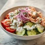 Zesty Tzatziki Chicken Salad is a light and flavorful dish combining tangy Greek yogurt and fresh cucumber with tender shredded rotisserie chicken. Perfect for a quick lunch or dinner, this salad is easy to prepare and pairs wonderfully with mixed greens or gluten-free pita bread for a refreshing Mediterranean-inspired meal.